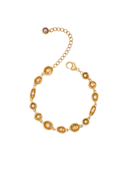 An 18K solid gold bracelet featuring thirteen sculpted, organic dewdrops. Each drop cradles a radiant diamond, accenting the simple, elegant chain. Pink pearl pod on the extender chain. Reversible & adjustable.