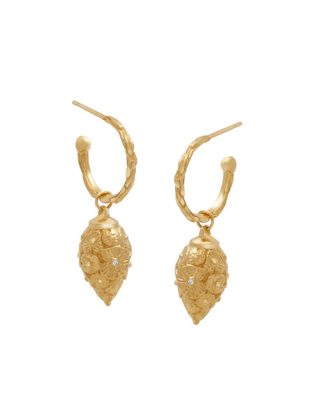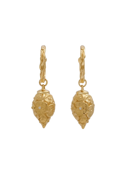 Drop earrings shaped like a vase crafted in 18K solid gold. Indented with intricate lily pads clustered like organic armor. One radiant diamond faces front in each drop earring. Three-dimensional, designed perfectly for motion.