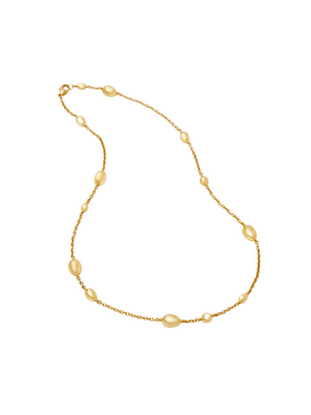 An 18K solid gold necklace featuring thirteen organic, sculptural water drops, punctuated by the chain. Radiant diamonds and pink pearls are set inside each drop.
