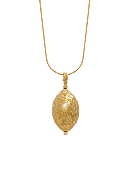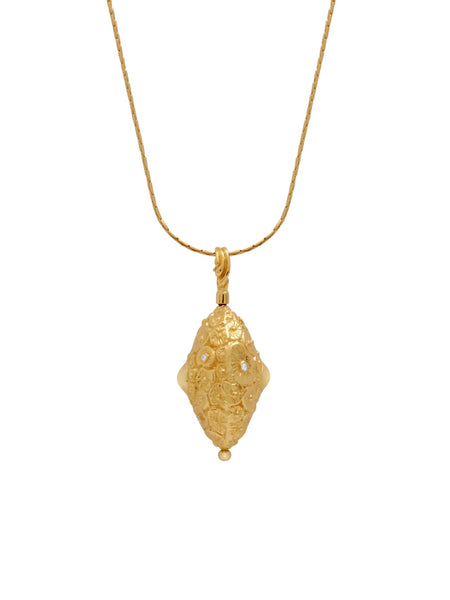 This textured organic lily pad motif articulates nature’s interconnectedness in 18K solid gold. A pendant that spins on its axis invites touch and symbolises life’s cyclical existence. Six radiant diamonds are sprinkled throughout. Presented on an 18K solid gold Cardano chain.