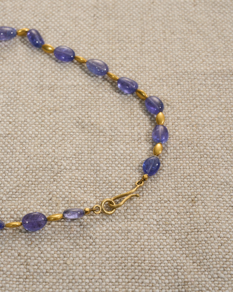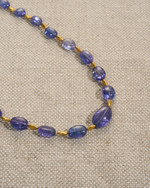 Tanzanite bead necklace in 18ct gold. Prized for its rare blue-violet hue, tanzanite is found exclusively in northern Tanzania and ranks among the world's most precious gemstones.